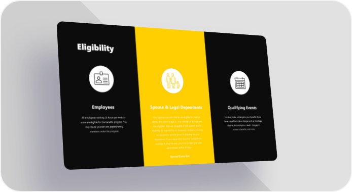 Eligibility Employees Spouse & Legal Dependents Qualifying Events All employees working 30 hours per week or Your legal spouse and children are eligible for medical, You may make a change to your benefits if you more are eligible for the benefits program. You dental, and vision to age 26. Your children of any age are have a qualified status change such as: marriage, may insure yourself and eligible family also eligible if they are incapable of self-support due to divorce, birth/adoption, death, changes in members under the program. disability. As required by our insurance contracts, you may spouse’s benefits, and more. be required to provide proof of eligibility for your dependents. If your dependent becomes ineligible for coverage during the year, you must contact your plan administrator within 30 days. Spousal Carve-Out
