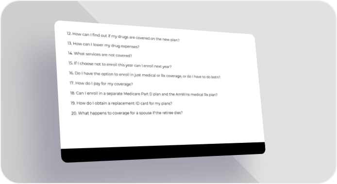 12. How can I find out if my drugs are covered on the new plan? 13. How can I lower my drug expenses? 14. What services are not covered? 15. If I choose not to enroll this year can I enroll next year? 16. Do I have the option to enroll in just medical or Rx coverage, or do I have to do both? 17. How do I pay for my coverage? 18. Can I enroll in a separate Medicare Part D plan and the AmWins medical Rx plan? 19. How do I obtain a replacement ID card for my plans? 20. What happens to coverage for a spouse if the retiree dies?