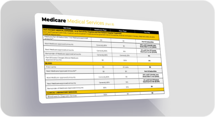 Medicare Medical Services (Part B) Services Medicare Pays Plan Pays You Pay OUT-PATIENT MEDICAL EXPENSES - In or Out of the Hospital and Out-Patient Hospital Treatment, such as Physician's services, inpatient and outpatient medical and surgical services and supplies, physical and speech therapy, diagnostic tests, durable medical equipment: Medicare Part B Deductible: First Medicare-approved amounts** $0 $0 Part B Deductible Next Medicare-approved amounts Generally 80% $0 20% until Calendar year deductible is met ($400) Next Medicare-approved amounts Generally 80% 16% 4% until Out Of Pocket Maximum is met ($1,250) Remainder of Medicare-approved amounts Generally 80% Generally 20% 0% Part B Excess Charges (Above Medicare Approve Amounts) $0 100% 0% BLOOD First 3 pints $0 All costs $0 Next Medicare Approved Amounts** $0 $0 Part B Deductible Next Medicare-approved amounts Generally 80% $0 20% until Calendar year deductible is met ($400) Next Medicare-approved amounts Generally 80% 16% 4% until Out Of Pocket Maximum is met ($1,250) Remainder of Medicare Approved Amounts 80% 20% $0 CLINICAL LABORATORY SERVICES Blood tests for Diagnostic Services 100% $0 $0