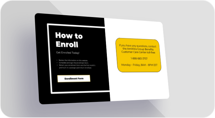 How to Enroll • Review the information on this website. • Complete and sign the enrollment form. • Return your enrolment form and the first month’s premium in a postage-paid return envelope. Get Enrolled Today! Enrollment Form If you have any questions, contact the AmWins Group Benefits Customer Care Center toll-free 1-888-883-3757 Monday – Friday, 8AM – 8PM EST