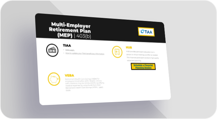 TIAA TIAA Login How to update your TIAA beneficiary information HUB HUB provides participant education via in- person or virtual meetings, as often as needed. This improves participant access to high quality retirement planning. Multi - Employer Retirement Plan (MEP) | 403(b) Schedule a Financial Planning Session Retirement Health Care Savings (VEBA) for employees hired before 2013. Eligible retirees with a balance may be reimbursed for qualifying medical expenses by using funds from their Retirement Health Care Savings (VEBA). Learn more . VEBA
