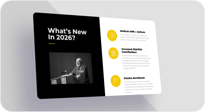 Whats New In 2026? Medical: UMR Anthem Our medical plan carrier is switching from UMR to Anthem. Download Anthems Sydney app to make the most of our new plans. Increased HSA/FSA Contributions For 2026, Health Savings Account (HSA) contribution limits will be $4,400 for self-only coverage and $8,750 for family coverage. For Flexible Spending Accounts (FSAs), the annual limit for dependent care FSAs will increase to $7,500. Passive Enrollment This years open enrollment is not active most of your 2025 elections will roll to 2026 if you do not make changes, with the exception of FSAs, which must be actively re-elected each year.