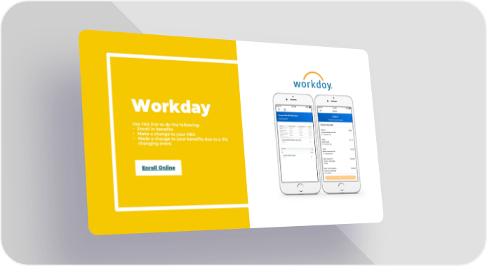 Workday Use this link to do the following: • Enroll in benefits • Make a change to your HSA • Made a change to your benefits due to a life changing event Enroll Online
