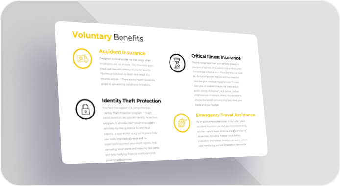 Voluntary Benefits Accident Insurance Designed to cover accidents that occur when employees are not at work. This insurance pays fixed cash benefits directly to you for specific injuries, procedures or death as a result of a covered accident. There are no health questions asked or pre-existing conditions limitations. Critical Illness Insurance This insurance pays fixed cash benefits directly to you upon diagnosis of a covered critical illness after the coverage effective date. These benefits can help pay for out-of-pocket medical and non-medical expenses your medical insurance doesn’t cover. Examples of covered illnesses are heart attack and/or stroke, Alzheimer’s, ALS, cancer, certain childhood conditions and others. You are able to choose the benefit amounts that best meet your needs and your budget. Emergency Travel Assistance As an active employee enrolled in Sun Life’s Life or Accident insurance, you and your immediate family are members of Assist America and are entitled to its services, including: medical consultation, evaluation, and referral, hospital admission, critical care monitoring, and lost prescription assistance. Identity Theft Protection You have the support of a comprehensive Identity Theft Protection program through Assist America’s SecurAssist Identity Protection program. It provides: 24x7 telephone support and step-by-step guidance by anti-fraud experts, a case worker assigned to you to help you notify the credit bureaus and file paperwork to correct your credit reports, help canceling stolen cards and reissuing new cards, and help notifying financial institutions and government agencies.