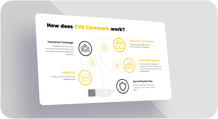 How does CVS Caremark work? Medical ID Provide the pharmacy with your medical ID card. Insurance Coverage The pharmacy will run your prescriptions through insurance and the total amount due is owed to the pharmacy. Deductible Reached Once you reach the deductible amount, you will then pay your share of coinsurance per the chart on the previous slide. Deductible Contribution The total amount owed will then count towards your deductible. Out-of-Pocket Max Once you reach your total out-of- pocket max, your insurance will pay 100%.