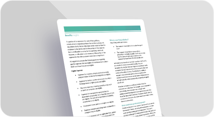 If a portion of an expense is for care of the qualifying Who is a qualifying individual? individual and a separate portion is for another purpose, IRS A qualifying individual includes: regulations clarify that an allocation can be made to allow the • The taxpayer’s dependent who is under the age of employee to be reimbursed for the portion of that expense 13; or that is attributable to caring for the qualifying individual. However, an allocation is not necessary if the portion of the • The taxpayer’s dependent or spouse who is expense for the other purpose is minimal or insignificant. physically or mentally incapable of self-care and who IRS regulations provide the following guidance regarding has the same principal place of abode as the specific expenses that are eligible for reimbursement under a taxpayer for more than half of the taxable year. DCAP and those that are not eligible: Individuals are physically or mentally incapable of self-care if, Eligible Expenses as a result of a physical or mental disability, they are incapable of caring for their own hygiene or nutritional needs, • Expenses for a nursery school, preschool or similar or require full-time attention of another person for their own program below the level of kindergarten are eligible. safety or the safety of others. The individual’s inability to engage in any substantial gainful activity or perform the • Expenses for before- or after-school care of a child in normal household chores or care for minor children does not kindergarten or a higher grade are eligible. in itself make the individual physically or mentally incapable • Day camp expenses, including specialty camps such of self-care. as sports or computer, are eligible. Whether someone is a qualifying individual must be • Expenses for transportation provided by the calculated on a daily basis. For example, upon a dependent’s dependent care provider to or from the place of care 13th birthday, the employee may no longer seek are eligible. The cost of transportation provided by reimbursement for dependent care expenses incurred after anyone else is not eligible. his or her dependent’s birthday. Employees should take into • Employment taxes paid to a caregiver are eligible. consideration the daily calculation requirement when making their annual elections. • Expenses related to providing room and board to a What constitutes gainful employment? caregiver may be eligible. Gainful employment may consist of service within or outside • Indirect expenses such as application fees, agency the taxpayer’s home, including self-employment, and time fees or deposits paid to obtain dependent care spent actively seeking gainful employment. Time spent services are eligible. actively seeking gainful employment includes time spent as a Ineligible Expenses full-time student in an educational organization. Where the purpose of the expense is to enable the taxpayer and the • Expenses for kindergarten or higher grade levels are taxpayer’s spouse to be gainfully employed depends upon the not eligible. facts and circumstances of the particular case. Whether an • Expenses for overnight camps are not eligible. expense was related to gainful employment is calculated on a daily basis. • Payments to either the taxpayer’s spouse or to a If an employee is married, the employee’s spouse must be parent of the taxpayer’s child who is not the employed (including self-employed), be actively seeking taxpayer’s spouse are not eligible. gainful employment or be a full-time student in an educational organization during the time that the employee seeks reimbursement of dependent care expenses.