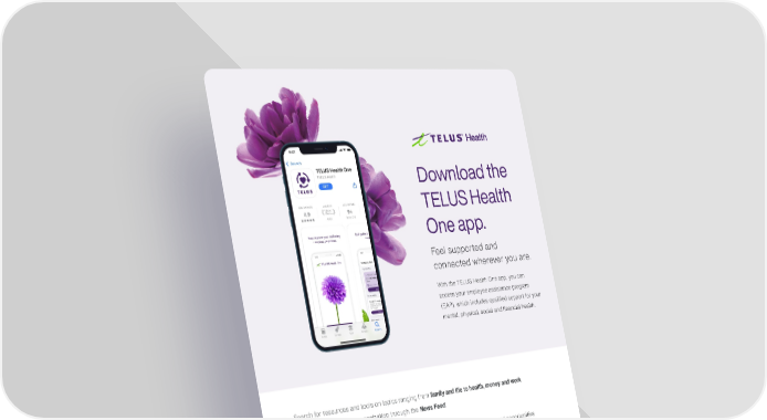 • Search for resources and tools on topics ranging from family and life to health, money and work • Stay connected to your organization through the News Feed • Receive support on your own schedule with CareNow • Access the Total Wellbeing Assessment to help identify your wellbeing strengths and opportunities for improvement What’s more, the app acts like your digital wallet card. You can call an EAP advisor with just one tap – toll-free, 24/7 – for expert advice, resources and referrals. Call us, 24/7: Download the TELUS Health One app today for convenient access to wellbeing support. 1. Download the free app on Android or iOS – simply search for ‘TELUS Health One’. 2. Enter: Click “Next” and you will be redirected to single sign on for your organization. GET IT ON Download the TELUS Health One app. Feel supported and connected wherever you are. With the TELUS Health One app, you can access your employee assistance program (EAP), which includes qualified support for your mental, physical, social and financial health.