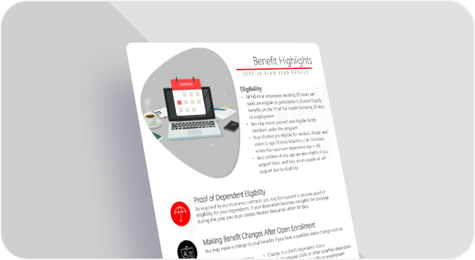 Page 5 | Duncan Supply Company, Inc.| Plan Year 2025 Open Enrollment This booklet provides only a summary of your benefits. All services described within are subject to the definitions, limitations, and exclusions set forth in each insurance carrier or provider’s contract. Benefit Highlights 2 0 2 5 - 2 6 P L A N Y E A R D E T A I L S Proof of Dependent Eligibility As required by our insurance contracts, you may be required to provide proof of eligibility for your dependents. If your dependent becomes ineligible for coverage during the year, you must contact Human Resources within 30 days. Eligibility • All full-time employees working 30 hours per week are eligible to participate in Duncan Supply benefits on the 1st of the month following 30 days of employment. • You may insure yourself and eligible family members under the program. • Your children are eligible for medical, dental, and vision to age 26 (and Voluntary Life Insurance where the maximum dependent age is 26) • Your children of any age are also eligible if you support them, and they are incapable of self- support due to disability. Last Day of Benefits Upon full-time separation of service, benefits will end on the last day of the month of your date of termination. Compliance The offered plans meet essential and affordable guidelines in compliance with the Affordable Care Act. All Federal and State required plan notices can be found in PlanSource. You may also request a printed copy of all notices, free of charge, upon request. • Change in a child’s dependent status • Death of a spouse, child, or other qualified dependent • Change in your spouse’s benefits or employment status Making Benefit Changes After Open Enrollment You may make a change to your benefits if you have a qualified status change such as: • Change in marital status • Birth or adoption of a child
