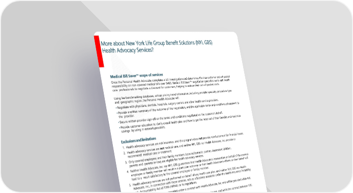 Page 24 | Duncan Supply Company, Inc.| Plan Year 2025 Open Enrollment This booklet provides only a summary of your benefits. All services described within are subject to the definitions, limitations, and exclusions set forth in each insurance carrier or provider’s contract. More about New York Life Group Benefit Solutions (NYL GBS) Health Advocacy Services? Medical Bill Saver scope of services Once the Personal Health Advocate completes a bill investigation and determines the true customer out-of-pocket responsibility on non-covered medical bills over $400, Medical Bill Saver negotiation specialists work with health care professionals to negotiate a discount for customers, helping to reduce their out-of-pocket costs. Using fee benchmarking databases, critical pricing trend information, including provider specialty, procedure type and geographic region, the Personal Health Advocate will: • Negotiate with physicians, dentists, hospitals, surgery centers and other health service providers. • Provide a written summary of the outcome of the negotiation, and the applicable terms and conditions of payment to the provider. • Secure written provider sign-off on the terms and conditions negotiated on the customer’s behalf. • Provide customer education to clarify overall health plan and how to get the most out of their benefits and maximize savings by using in-network providers. Exclusions and limitations 1. Health advocacy services are not insurance, and this program does not provide reimbursement for financial losses. 2. Health advocacy services are not medical care, and neither NYL GBS nor Health Advocate, Inc. provide or recommend medical care or treatment. 3. Only covered employees and their family members (spouse/domestic partner, dependent children, parents and parents-in-law) are eligible for health advocacy services. 4. Neither Health Advocate, Inc. nor NYL GBS guarantees that Health Advocate’s intervention on behalf of the covered employee or family member will result in a particular outcome or that Health Advocate’s efforts on their behalf will lead to a result satisfactory to the covered employee or family member. 5. Health advocacy services are not performed on behalf of any health care plan, and neither NYL GBS nor Health Advocate, Inc., in connection with these services, acts as a business associate under the Health Insurance Portability and Accountability Act of 1996 (HIPAA) or its regulations. 6. Health advocacy services are provided under a contract with Health Advocate, Inc. and will be provided while NYL GBS is providing life or disability insurance or services to you for your employees, and while the contract between NYL GBS and Health Advocate, Inc. is in effect. 7. NYL GBS and Health Advocate, Inc. reserve the right to make changes in the services provided to the extent necessary to comply with applicable laws or regulations. 8. Neither NYL GBS nor Health Advocate, Inc. will have any liability for delay or non-fulfillment of services resulting from acts not within either party’s control, including but not limited to acts of God, war, riots, civil disturbances, strikes, accident, fire, transportation conditions, labor and/or material shortages, governmental controls, regulations and permits, and/or embargoes. Personal Health Advocates are available Monday through Friday between 8:00 am and 12 midnight EST at a dedicated NYLGBS toll-free number: (866) 799-2725. Resources are available by phone 24/7 at the same toll-free number and a Personal Health Advocate will reach out to the caller the next business day. Services include but are not limited to those described on the pages above.
