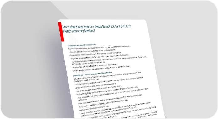 Page 23 | Duncan Supply Company, Inc.| Plan Year 2025 Open Enrollment This booklet provides only a summary of your benefits. All services described within are subject to the definitions, limitations, and exclusions set forth in each insurance carrier or provider’s contract. Senior care and special needs services The Personal Health Advocate may assist with senior care and special needs services to locate: • Eldercare facilities, group homes, nursing homes, adult day care, etc. • Homemakers, home health aides, private duty nurses, rehabilitation services. • Physicians who make house calls for people who cannot easily get to the doctor’s office. • Autism spectrum disorder-related in-home, school- and community-based services, treatment centers, day camps and ASD-friendly doctors, dentists, hair dressers, etc. • Find the right doctors and specialists and schedule appointments. • Answer questions about their insurance plan, test results, treatments and medications. Administrative support services – benefits and claims NYL GBS Health Advocacy Services also includes assistance with medical, dental and vision benefit claims. The Personal Health Advocate may: • Provide information and assistance regarding benefits, coverage, eligibility, claims and related paperwork. • Assist with preauthorization and predetermination process. • Assist with transition from out-of-network to in-network providers. • Help with eligibility, denials, and incorrectly applied provider coding deductibles and co-pays. • Help resolve incorrect plan procedure interpretations, such as emergency room claims denied for a lack of pre- certification. • Help resolve questions about whether services are condition-specific or related to preventive care. • Help resolve coordination of benefits disputes between multiple carriers. • Help obtain referrals for required services. • Locate in-network suppliers and obtaining plan approval for the use of out-of-network suppliers for necessary healthcare equipment and supplies that are not available from in-network suppliers. • Help customers understand the process for obtaining coverage for medical equipment, devices, supplies (e.g., hearing aids, diabetic supplies, compression stockings, etc.). • Help customers through the review and appeals process, including if necessary filing grievances, gathering supporting documentation, writing appeal letters and participating with the customer during a conference or review. This service does not include legal advice or representation, which only an attorney can provide. Financial support services NYL GBS Health Advocacy Services also helps customers to get the most out of their health care benefits. Personal Health Advocates may: • Counsel customers regarding current benefit costs and the cost of alternative approaches. • Provide comparative cost estimates for the service in question. • Negotiate fees with healthcare providers prior to services to lower the customer’s out-of-pocket costs. • Review questionable bills to catch duplicate or erroneous charges. • Provide zip-code based cost estimates for common medical services and procedures. • Conduct initial investigation of medical bills to ascertain the customer’s true out-of-pocket responsibility for the remaining balance. More about New York Life Group Benefit Solutions (NYL GBS) Health Advocacy Services?