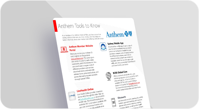 Page 10 | Duncan Supply Company, Inc.| Plan Year 2025 Open Enrollment This booklet provides only a summary of your benefits. All services described within are subject to the definitions, limitations, and exclusions set forth in each insurance carrier or provider’s contract. Anthem Tools to Know Anthem Member Website Portal Once you receive your Anthem ID card, register on the portal at www.anthem.com. The portal gives you access to your ID cards, claim summaries, and EOB statements. You can search and compare costs of different providers and services, download claims and mail order delivery forms, price medications, and access discount programs available through Special Offers. LiveHealth Online Live Health Online provides immediate doctor visits through live video. Sign up at livehealthonline.com or download the mobile app. Board certified physicians available 24/7, prescriptions available, $59 per visit. Licensed psychiatrists and psychologists are also available at an additional cost. Pharmacy Immunization If your physician has given you a prescription for the flu, pneumonia, or shingles vaccine, you can have that vaccine administered at a participating pharmacy. Visit CVS, Kroger, Meijer, Target, Walgreens, and Walmart and show them your ID card. The coverage is the same as if you were in your doctor’s office. There is no cost to you. Sydney Mobile App Download the mobile app to get a copy of your ID card immediately via your phone (which can be faxed or emailed to your provider); compare costs of nearby doctors for different procedures; search for in- network doctors, urgent care centers or hospitals; check the cost of drugs or get refills; and view your mobile Health Record and share it with your doctor. 24-Hour NurseLine Anthem has you covered by offering a 24/7 nurseline. You can get help finding providers or getting advice for minor illnesses or injuries. Call (800) 337-4770 to speak to a nurse anytime, day or night. Discounts Get discounts on LASIK, hearing aids, activity trackers, gym memberships, pet insurance, glasses and contacts, vitamins, smoking cessation classes, as well as other health improvement products. Visit your Anthem portal and select Discounts to view the member exclusive offers. BCBS Global Core When you travel outside the U.S., your Anthem group plan covers you in the event of an emergency. A Service Center is available 24/7 to assist you in finding a doctor or hospital. Visit bcbsglobalcore.com for more information regarding Service Center contact information and claim forms. As a member of an Anthem Medical Plan, you have access to a variety of tools that save you time, money, and help keep you better informed about your medical plan offerings and plan usage.