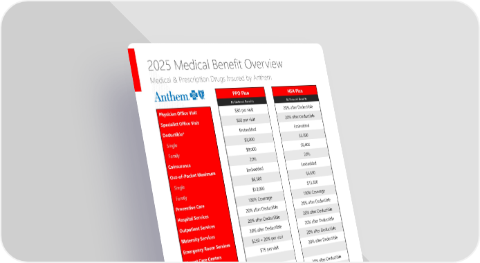 Page 7 | Duncan Supply Company, Inc.| Plan Year 2025 Open Enrollment This booklet provides only a summary of your benefits. All services described within are subject to the definitions, limitations, and exclusions set forth in each insurance carrier or provider’s contract. 2025 Medical Benefit Overview Medical & Prescription Drugs Insured by Anthem The medical plan is administered by Anthem Blue Access, which offers discounts through the largest national network of doctors and hospitals. For the best benefits and value, it's recommended to use network providers, though it’s not required. Services outside the network will cost more. Employees can visit anthem.com or use the Sydney Health app to find participating providers. PPO Plan HSA Plan IN-Network Benefits IN-Network Benefits Physician Office Visit $30 per visit 20% after Deductible Specialist Office Visit $50 per visit 20% after Deductible Deductible* Embedded Embedded Single $3,000 $3,300 Family $9,000 $6,400 Coinsurance 20% 20% Out-of-Pocket Maximum Embedded Embedded Single $6,500 $6,650 Family $13,000 $13,300 Preventive Care 100% Coverage 100% Coverage Hospital Services 20% after Deductible 20% after Deductible Outpatient Services 20% after Deductible 20% after Deductible Maternity Services 20% after Deductible 20% after Deductible Emergency Room Services $250 + 20% per visit 20% after Deductible Urgent Care Centers $75 per visit 20% after Deductible Mental Health Inpatient 20% after Deductible 20% after Deductible Outpatient 20% after Deductible 20% after Deductible Lifetime Maximum Unlimited Unlimited *Some Generic Rx medications used to prevent chronic conditions are not subject to the individual and/or family deductibles.
