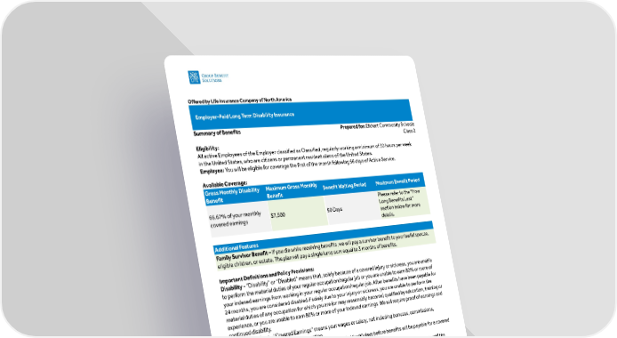 When Coverage Takes Effect - Your coverage takes effect on the later of the policy’s effective date, the date you become eligible, the date we receive your completed enrollment form if required, or the date you authorize any necessary payroll deductions if applicable. If you’re not actively at work on the date your coverage would otherwise take effect, your coverage will take effect on the date you return to work. If you have to submit proof of good health, your coverage takes effect on the date we agree, in writing, to cover you. Benefit Reductions, Conditions, Limitations and Exclusions: Effects of Other Income Benefits - This plan is structured to prevent your total benefits and post-disability earnings from equaling or exceeding pre-disability earnings. Therefore, we reduce this plan’s benefits by an amount equal to any Social Security retirement and/or disability benefits payable to you, your dependents, or a qualified third party on behalf of you or your dependents. Your disability benefits will not be reduced by any Social Security disability benefits you are not receiving as long as you cooperate fully in efforts to obtain them and agree to repay any overpayment when and if you do receive them. Disability benefits will be reduced by amounts received through other government programs, sick pay, employer funded retirement benefits, workers’ compensation, franchise/group insurance, auto no-fault, and damages for wage loss. For details, see your Certificate of Insurance. Earnings While Disabled - During the first 24 months that benefits are payable, benefits will be reduced if benefits plus income from employment exceeds 100% of pre-disability Covered Earnings. After that, benefits will be reduced by 50% of earnings from employment. Limited Benefit Period - Disabilities caused by or contributed to by any one or more of the following conditions are subject to a lifetime limit of 24 months for outpatient treatment: Anxiety-disorders, delusional (paranoid) or depressive disorders, eating disorders, Mental Illness, somatoform disorders (including psychosomatic illnesses) or Substance Abuse. Benefits are payable during periods of hospital confinement for these conditions for hospitalizations lasting more than 14 consecutive days that occur before the 24-month lifetime outpatient limit is exhausted. Pre-existing Condition Limitation - Benefits are not payable for medical conditions for which you incurred expenses, took prescription drugs, received medical treatment, care or services (including diagnostic measures), or for which a reasonable person would have consulted a physician during the 3 months just prior to the most recent effective date of insurance. Benefits are not payable for any disability resulting from a pre-existing condition unless the disability occurs after you have been insured under this plan for at least 12 months after your most recent effective date of insurance. Termination of Disability Benefits - Your benefits will terminate when your Disability ceases, when your benefit duration period is exceeded, you earn more than your allowable Covered Earnings, or the date benefits end because you did not comply with the terms and conditions of the policy. Exclusions - This plan does not pay benefits for a Disability which results, directly or indirectly, from any of the following: Suicide, attempted suicide, or intentionally self-inflicted injury while sane or insane; War or any act of war, whether or not declared; Active participation in a riot; Commission of a felony; The revocation, restriction or non-renewal of an Employee’s license, permit or certification necessary to perform the duties of his or her occupation unless due solely to Injury or Sickness otherwise covered by the Policy. In addition, the plan does not pay disability benefits any period of Disability during which you are incarcerated in a penal or corrections institution. Terms and conditions of coverage for Long Term Disability insurance are set forth in Group Policy No. LK0965082. This is not intended as a complete description of the insurance coverage offered. This is not a contract. Complete coverage details, including premiums, are contained in the Policy Certificate. If there are any differences between this summary and the group policy, the information in the group policy takes precedence. Product availability and/ or features may vary by state. Please keep this material as a reference. Insurance coverage is issued on group policy form number: Policy Form TL-004700. Coverage is underwritten by Life Insurance Company of North America, 51 Madison Avenue, New York, NY 10010. Group insurance products are insured by Life Insurance Company of North America and New York Life Group Insurance Company of NY, affiliates of New York Life Insurance Company. ©2024 New York Life Group Insurance Company, New York, NY. All Rights Reserved. NEW YORK LIFE and the New York Life box logo are trademarks of New York Life Insurance Company. Created on 05/2024