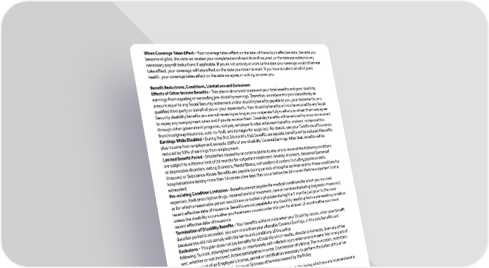 When Coverage Takes Effect - Your coverage takes effect on the later of the policy’s effective date, the date you become eligible, the date we receive your completed enrollment form if required, or the date you authorize any necessary payroll deductions if applicable. If you’re not actively at work on the date your coverage would otherwise take effect, your coverage will take effect on the date you return to work. If you have to submit proof of good health, your coverage takes effect on the date we agree, in writing, to cover you. Benefit Reductions, Conditions, Limitations and Exclusions: Effects of Other Income Benefits - This plan is structured to prevent your total benefits and post-disability earnings from equaling or exceeding pre-disability earnings. Therefore, we reduce this plan’s benefits by an amount equal to any Social Security retirement and/or disability benefits payable to you, your dependents, or a qualified third party on behalf of you or your dependents. Your disability benefits will not be reduced by any Social Security disability benefits you are not receiving as long as you cooperate fully in efforts to obtain them and agree to repay any overpayment when and if you do receive them. Disability benefits will be reduced by amounts received through other government programs, sick pay, employer funded retirement benefits, workers’ compensation, franchise/group insurance, auto no-fault, and damages for wage loss. For details, see your Certificate of Insurance. Earnings While Disabled - During the first 24 months that benefits are payable, benefits will be reduced if benefits plus income from employment exceeds 100% of pre-disability Covered Earnings. After that, benefits will be reduced by 50% of earnings from employment. Limited Benefit Period - Disabilities caused by or contributed to by any one or more of the following conditions are subject to a lifetime limit of 24 months for outpatient treatment: Anxiety-disorders, delusional (paranoid) or depressive disorders, eating disorders, Mental Illness, somatoform disorders (including psychosomatic illnesses) or Substance Abuse. Benefits are payable during periods of hospital confinement for these conditions for hospitalizations lasting more than 14 consecutive days that occur before the 24-month lifetime outpatient limit is exhausted. Pre-existing Condition Limitation - Benefits are not payable for medical conditions for which you incurred expenses, took prescription drugs, received medical treatment, care or services (including diagnostic measures), or for which a reasonable person would have consulted a physician during the 3 months just prior to the most recent effective date of insurance. Benefits are not payable for any disability resulting from a pre-existing condition unless the disability occurs after you have been insured under this plan for at least 12 months after your most recent effective date of insurance. Termination of Disability Benefits - Your benefits will terminate when your Disability ceases, when your benefit duration period is exceeded, you earn more than your allowable Covered Earnings, or the date benefits end because you did not comply with the terms and conditions of the policy. Exclusions - This plan does not pay benefits for a Disability which results, directly or indirectly, from any of the following: Suicide, attempted suicide, or intentionally self-inflicted injury while sane or insane; War or any act of war, whether or not declared; Active participation in a riot; Commission of a felony; The revocation, restriction or non-renewal of an Employee’s license, permit or certification necessary to perform the duties of his or her occupation unless due solely to Injury or Sickness otherwise covered by the Policy. In addition, the plan does not pay disability benefits any period of Disability during which you are incarcerated in a penal or corrections institution. Terms and conditions of coverage for Long Term Disability insurance are set forth in Group Policy No. LK0965082. This is not intended as a complete description of the insurance coverage offered. This is not a contract. Complete coverage details, including premiums, are contained in the Policy Certificate. If there are any differences between this summary and the group policy, the information in the group policy takes precedence. Product availability and/ or features may vary by state. Please keep this material as a reference. Insurance coverage is issued on group policy form number: Policy Form TL-004700. Coverage is underwritten by Life Insurance Company of North America, 51 Madison Avenue, New York, NY 10010. Group insurance products are insured by Life Insurance Company of North America and New York Life Group Insurance Company of NY, affiliates of New York Life Insurance Company. ©2024 New York Life Group Insurance Company, New York, NY. All Rights Reserved. NEW YORK LIFE and the New York Life box logo are trademarks of New York Life Insurance Company. Created on 05/2024