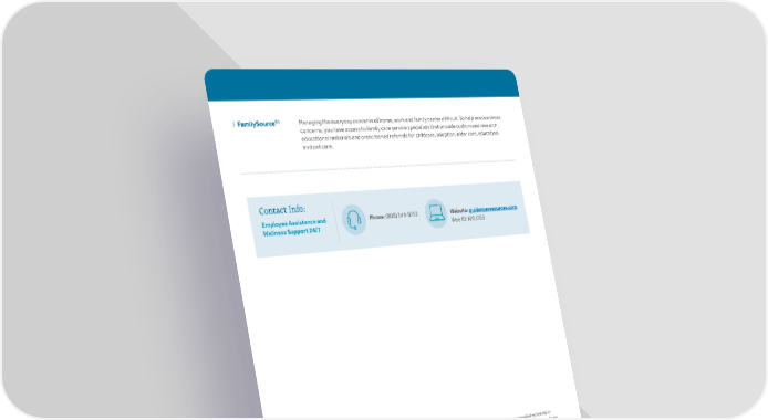 ®1 Managing the everyday concerns of home, work and family can be difficult. To help resolve those FamilySource concerns, you have access to family care service specialists that provide customized research, educational materials and prescreened referrals for childcare, adoption, elder care, education, and pet care. Contact Info: Employee Assistance and Phone: (800) 344-9752 Website: guidanceresources.com Wellness Support 24/7 Web ID: NYLGBS 1. These programs are NOT insurance and do not provide reimbursement for 昀椀nancial losses. Some restrictions may apply. These services are provided exclusively by ® ComPsych Corporation. Customers are required to pay the entire discounted charge for any discounted products or services available through these programs. Some services are available at the option of the employer for an additional cost. Programs are provided through third party vendors who are solely responsible for their products and services. Full terms, conditions and exclusions are contained in the applicable client program description and are subject to change. Program availability may vary by plan type and location and are not available where prohibited by law. These programs are not available under policies issued by New York Life Group Insurance Company of NY. FamilySource and GuidanceResources are registered trademarks of ComPsych Corporation. All programs are e昀昀ective for the member/participant on the 昀椀rst day of coverage. New York Life Group Bene昀椀t Solutions products and services are provided by Life Insurance Company of North America or New York Life Group Insurance Company of NY, subsidiaries of New York Life Insurance Company. Life Insurance Company of North America is not authorized in NY and does not conduct business in NY. New York Life Insurance Company 51 Madison Avenue New York, NY 10010 © 2022, New York Life Insurance Company. All rights reserved. NEW YORK LIFE,and the NEW YORK LIFE Box Logo are trademarks of New York Life Insurance Company. 123741 0822 SMRU 1951110 Exp. Date 09.08.2024