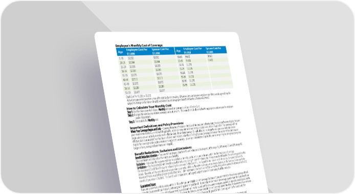 Employee’sMonthly Cost of Coverage: Age Employee Cost Per Spouse Cost Per Age Employee Cost Per Spouse Cost Per $1,000 $1,000 $1,000 $1,000 0-19 $0.050 $0.050 60-64 $0.692 $0.692 20-24 $0.044 $0.044 65-69 $1.655 $1.655 25-29 $0.058 $0.058 70-74 $3.218 30-34 $0.069 $0.069 75-79 $3.218 35-39 $0.079 $0.079 80-84 $3.218 40-44 $0.112 $0.112 85-89 $3.218 45-49 $0.170 $0.170 90-94 $3.218 50-54 $0.289 $0.289 95-99 $3.218 55-59 $0.477 $0.477 Child Cost Per $1,000 = $0.200 Actual per pay period premiums may differ slightly due to rounding. All spouse rates are based on employee age. Rates vary by age and may be subject to change in the future. Benefits will reduce based on age (see Benefits Reduction Schedule for details). How to Calculate YourMonthly Cost: Step 1: Use the chart above to find your Monthly rate based on your age as of your effective date. Step 2: Multiply this rate by your desired coverage amount, in units. Reference the table above to find the appropriate unit amounts for employee and/or dependents. Step 3: The result is the Monthly cost. Important Definitions and Policy Provisions: WhenYourCoverageBeginsandEnds–Coverage becomes effective on the later of the program’s effective date, the date you become eligible, the date your enrollment elections are received if applicable, or the date you authorize any necessary payroll deductions if applicable. Your coverage will not begin unless you are actively at work on the effective date. Dependent coverage, if applicable, will not begin for any spouse or child who on the effective date is an inpatient in a facility or is home confined and under the care of a physician. Coverage will end on the earliest of the date you are eligible for coverage under a plan intended to replace this coverage, you or your dependents if applicable, are no longer eligible, the group policy is no longer in force, or required premiums are not paid. Benefit Reductions, Exclusions and Limitations: Benefit Reduction Schedule - If you are still employed, your benefits will reduce to 65% at age 65, 45% at age 70, 30% at age 75 and 20% at age 80. Your premiums will also reduce to match your benefits. Exclusions - Voluntary life insurance will not be paid if you commit suicide, while sane or insane, within the first two years of coverage. Limitations - The Accelerated Death Benefit is payable only once. Using this benefit reduces the life insurance death benefit. The amount payable under the Accelerated Death Benefit may be reduced by the amount of other benefits already paid to the insured under the policy. See your certificate for details. Benefits will be extended without premium payment until the earlier of the date you are no longer disabled, or the date you fail to qualify for Waiver of Premium or fail to provide proof of Disability. After premiums have been waived for 12 months, they will be waived for future periods of 12 months if you remain Disabled. This benefit will remain active until age 65 subject to proof of continuing disability each year. Guaranteed Issue: If you are a new hire and you apply within 31 days after you are eligible to elect coverage for yourself, you are entitled to choose any coverage offered up to the Guaranteed Issue Amount, without providing proof of good health. If you apply for an amount of coverage greater than the Guaranteed Issue Amount, coverage in excess of the Guaranteed Issue Amount will not be issued until the insurance company approves acceptable proof of good health. If you apply for coverage yourself more than 31 days from the date you become eligible to elect coverage under this plan, the Guaranteed Issue Amount will not apply, unless Guaranteed Issue has been approved by your employer for a specific period of time. Coverage will not be issued until the insurance company approves acceptable proof of good health. These are summarized definitions only. To be eligible for coverage, the covered illness or event must meet the definitions and other terms and conditions set forth in the group policy. THIS POLICY PROVIDES LIMITED COVERAGE. IT PAYS A FIXED BENEFIT AND DOES NOT COVER MEDICAL EXPENSES AS INCURRED. THIS IS NOT A SUBSTITUTE FOR COMPREHENSIVE OR MAJOR MEDICAL HEALTH INSURANCE. THIS COVERAGE DOES NOT SATISFY THE INDIVIDUAL MANDATE OF THE AFFORDABLE CARE ACT BECAUSE THE COVERAGE DOES NOT MEET THE REQUIREMENTS OF MINIMUM ESSENTIAL COVERAGE. Terms and conditions of coverage for Term Life insurance are set forth in Group Policy No. FLX 967410. This is not intended as a complete description of the insurance coverage offered. This is not a contract. Complete coverage details, including premiums, eligible conditions, their respective payments and policy exclusions and limitations are contained in the Policy. Please see your Plan Sponsor to obtain a copy of the Policy. If there are any differences between this summary and the group policy, the information in the group policy takes precedence. Product availability, costs, benefits, riders, covered conditions and/or features may vary by state. Please keep this material as a reference. Insurance coverage is issued on group policy form number: Policy Form TL-004700. Coverage is underwritten by Life Insurance Company of North America, 51 Madison Avenue New York, NY 10010. Group insurance products are insured by Life Insurance Company of North America and New York Life Group Insurance Company of NY, affiliates of New York Life Insurance Company. ©2022New York Life Group Insurance Company, New York, NY. All Rights Reserved. NEW YORK LIFE and the New York Life box logo are trademarks of New York Life Insurance Company. Created on 02/2022
