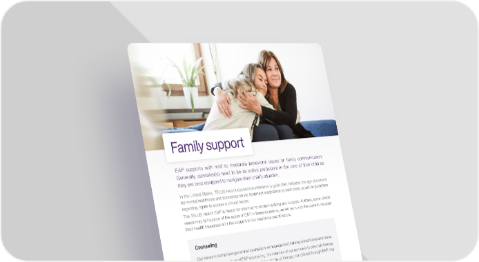 Family support EAP supports with mild to moderate behavioral issues or family communication. Generally, caretaker(s) need to be an active participant in the care of their child as they are best equipped to navigate their child’s situation. In the United States, TELUS Health counselors reference a guide that indicates the age of consent for mental healthcare and substance abuse treatment established by each state, as well as guidelines regarding rights to access a clinical record. The TELUS Health EAP is meant for short-term problem solving and support. At times, some clinical needs may fall outside of the scope of EAP. In these situations, we will work with the client to navigate their health insurance with the support of our insurance coordinators. Counseling Our network comprises generalist counselors with specialized training with children and teens. Given the general nature of EAP counseling, the intention of our service is to offer talk therapy which may not be suitable for children. Other forms of therapy not offered through EAP may be more appropriate (such as play therapy). Counselor specialization may be available through alternate modalities, such as telephone or video, but these are not recommended, as they are less effective with children. Counselors will manage clients with all presenting issues within the scope of their practice. Clinical counselors cannot ethically practice outside of their area of skill or training. When a child is exhibiting adult-like mental health symptoms (e.g. anxiety, depression, posttraumatic stress), the child is best served by a child psychologist or another specialist who can assess, diagnose and recommend the most appropriate treatment, all of which falls outside the scope of EAP.