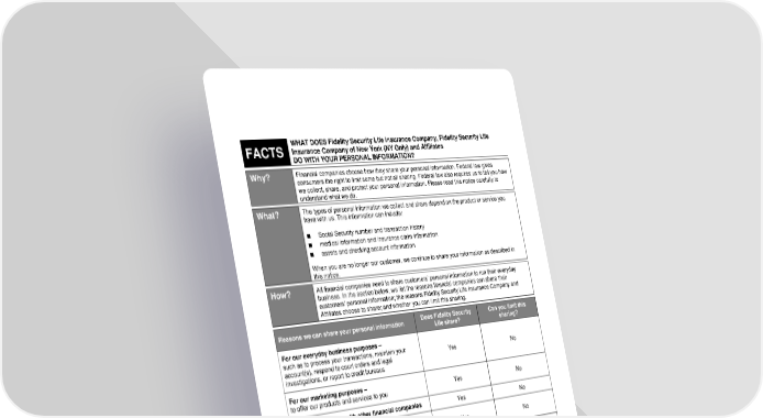 WHAT DOES Fidelity Security Life Insurance Company, Fidelity Security Life FACTS Insurance Company of New York (NY Only) and Affiliates DO WITH YOUR PERSONAL INFORMATION? Why? Financial companies choose how they share your personal information. Federal law gives consumers the right to limit some but not all sharing. Federal law also requires us to tell you how we collect, share, and protect your personal information. Please read this notice carefully to understand what we do. What? The types of personal information we collect and share depend on the product or service you have with us. This information can include: ■ Social Security number and transaction history ■ medical information and insurance claim information ■ assets and checking account information When you are no longer our customer, we continue to share your information as described in this notice. How? All financial companies need to share customers’ personal information to run their everyday business. In the section below, we list the reasons financial companies can share their customers’ personal information; the reasons Fidelity Security Life Insurance Company and Affiliates choose to share; and whether you can limit this sharing. Reasons we can share your personal information Does Fidelity Security Can you limit this Life share? sharing? For our everyday business purposes – such as to process your transactions, maintain your Yes No account(s), respond to court orders and legal investigations, or report to credit bureaus For our marketing purposes – Yes No to offer our products and services to you For joint marketing with other financial companies Yes No For our affiliates’ everyday business purposes – Yes No information about your transactions and experiences For our affiliates’ everyday business purposes – No We don’t share information about your creditworthiness For our affiliates to market to you No We don’t share For nonaffiliates to market to you No We don’t share Questions? Call 800-648-8624 or go to www.fslins.com or www.ftj.com N-00200 93-33087 Rev 0912