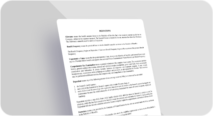 DEFINITIONS Allowance means the benefit amount shown in the Schedule of Benefits that is the maximum amount payable by the Company, subject to the expenses incurred. The Insured Person is responsible for any amounts due above the Allowance. The Allowance cannot be used to satisfy a Copayment. Benefit Frequency means the period of time in which a benefit is payable as shown in the Schedule of Benefits. The Benefit Frequency begins on September 1. Each new Benefit Frequency begins at the expiration of the previous Benefit Frequency. Copayment or Copay means the designated amount, if any, shown in the Schedule of Benefits each Insured Person must pay to a Provider before benefits are payable for a covered Vision Examination or Vision Materials per Benefit Frequency. Comprehensive Eye Examination means a general evaluation of the complete visual system. The examination includes history, general medical observation, external and ophthalmoscopic examinations, gross visual fields, basic sensorimotor examination and Refraction. It always includes initiation of diagnostic and treatment programs. It may include biomicroscopy, examination with cycloplegia or mydriasis and tonometry, as determined by the Provider. These services may be performed at different sessions, but comprise only one Comprehensive Eye Examination. Dependent means any of the following persons whose coverage under the Policy is in force and has not ended: 1. the Insured’s lawful spouse; 2. each child of the Insured or the Insured’s spouse who is under 26 years of age; or 3. each child at least 26 years of age who is primarily dependent upon the Insured or the Insured’s spouse for support and maintenance because the child is incapable of self-sustaining employment by reason of mental incapacity or physical handicap. Dependent includes a step-child, foster child, legally adopted child, child for whom the Insured is a party to a suit for adoption, child who has been placed in the Insured’s home for adoption and child under the Insured’s legal guardianship. Dependent will also include a child for whom the Insured is legally required to support due to court order or divorce decree. Formulary means a list, provided by the Company, of Vision Materials by tier, that are covered under the Policy as shown in the Schedule of Benefits. Insured means an employee of the Policyholder who meets the eligibility requirements as shown in the Policyholder’s application, and whose coverage under the Policy is in force and has not ended. Insured Person means the Insured. Insured Person will also include the Insured’s Dependents, if enrolled. In-Network Provider means a Provider who has signed a Preferred Provider Agreement with the PPO. Medically Necessary Contact Lenses means that adequate functional vision correction cannot be achieved with spectacles but can be achieved with contact lenses. Conditions that qualify for Medically Necessary Contact Lenses are: 1. Anisometropia of 3D in meridian powers; 2. High Ametropia exceeding -12D or +12D in meridian powers; 3. Keratoconus when vision is not correctable to 20/25 in either eye or both eyes using standard spectacle lenses; or 4. vision impairments, other than Keratoconus, when vision can be improved by two lines on the visual acuity chart when compared to best corrected standard spectacle lenses. Out-of-Network Provider means a Provider, located within the PPO Service Area, but is not an In-Network Provider. Policy means the Vision Insurance Policy issued to the Policyholder. C-9184IN 3