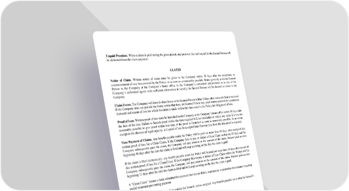 Unpaid Premium. When a claim is paid during the grace period, any premium due and unpaid for the Insured Person will be deducted from the claim payment. CLAIMS Notice of Claim. Written notice of claim must be given to the Company within 30 days after the occurrence or commencement of any loss covered by the Policy, or as soon as is reasonably possible. Notice given by or for the Insured Person to the Company at the Company’s home office, to the Company’s authorized administrator or to any of the Company’s authorized agents with sufficient information to identify the Insured Person will be deemed as notice to the Company. Claim Forms. The Company will furnish claim forms to the Insured Person within 15 days after notice of claim is received. If the Company does not provide the forms within that time, the Insured Person may send written proof of the occurrence, character and extent of loss for which the claim is made within the time stated in the Policy for filing proof of loss. Proof of Loss. Written proof of loss must be furnished to the Company at the Company’s home office within 90 days after the date of the loss. Failure to furnish proof within the time required will not invalidate or reduce any claim if it was not reasonably possible to give proof within that time, if the proof is furnished as soon as reasonably possible. In no event, except in the absence of legal capacity, will proof of loss be accepted later than one year from the time proof is required. Time Payment of Claims. Any benefit payable under the Policy will be paid not more than 45 days, after receipt of due written proof of loss for a Clean Claim. If the Company fails to pay or denies a Clean Claim within the 45 days and the Company subsequently pays the claim, the Company will pay interest on the amount of the claim. Interest paid accrues beginning 46 days after the date the claim is filed and will stop accruing on the date the claim is paid. If the claim is filed electronically, any benefit payable under the Policy will be paid not more than 30 days after receipt of due written proof of loss for a Clean Claim. If the Company fails to pay or denies a Clean Claim within the 30 days and the Company subsequently pays the claim, the Company will pay interest on the amount of the claim. Interest paid accrues beginning 31 days after the date the claim is filed and will stop accruing on the date the claim is paid. A “Clean Claim” means a claim submitted for payment that has no defect, impropriety or particular circumstance requiring special treatment preventing payment. Payment of Claims. All claims will be paid to the Insured, unless assigned. Any benefits payable on or after the Insured’s death will be paid to the Insured’s estate. Assignment. Benefits under the Policy may be assigned. Right of Recovery. If payment for claims exceeds the amount for which the Insured Person is eligible under any benefit provision or rider of the Policy, the Company has the right to recover the excess of such payment from the Provider or the Insured. Legal Actions. No Insured Person can bring an action at law or in equity to recover on the Policy until more than 60 days after the date written proof of loss has been furnished according to the Policy. No such action may be brought after the expiration of three years after the time written proof of loss is required to be furnished. If the time limit of the Policy is less than allowed by the laws of the state where the Insured Person resides, the limit is extended to meet the minimum time allowed by such law. C-9184IN 7