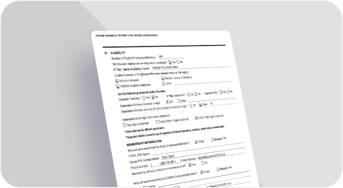 IV. ELIGIBILITY NumberofEligible Employees/Members: 338 Will this plan replace any existing vision coverage? XYes No AnthemBlueViewVision Eligible Class(es) of Employees/Members (please check all that apply): X Active employees X Retiree / Leave of Absence X COBRA eligible employees Other: Arethefollowing covered under the plan: Domestic Partners:* Yes X No If Yes, Same Sex:* Yes No Opposite Sex:* Yes No Dependent Children Covered to Age*: 26** Other Dependent Children who are full-time students covered to age*: 27 XOther 26 Dependent Child Age Termination based on: DayAgeisattained EndofMonthAgeisattained X Endof Year Age is attained MEMBERSHIPINFORMATION Whowill send enrollment for Active Employees/Members? X Group TPA If TPA, TPA Name: Group/TPAContact Name: Irene Taylor PhoneNumber: ( )260-726-9341 E-Mail Address: itaylor@jayschools.k12.in.us Membership will be an electronic membership file? X Yes No Whowill send enrollment for COBRA Employees/Members? X Group TPA If TPA, TPA Name: Group/TPAContact Name: Irene Taylor PhoneNumber: ( ) 260-726-9341 E-Mail Address: itaylor@jayschools.k12.in.us Membership will be an electronic membership file? X Yes No PROBATIONARYPERIOD For New Employees/Members: 30days 60days 90days 180days Other 1stmo.after hire Probationary Period is waived for present Employees/Members: Yes No NumberofEmployees/Memberswhohavenot yet completedthe probationary period: 0 V. PLANSELECTION Please refer to the attached proposal page. Services are provided by EyeMed Vision Care. A-01224IN 2
