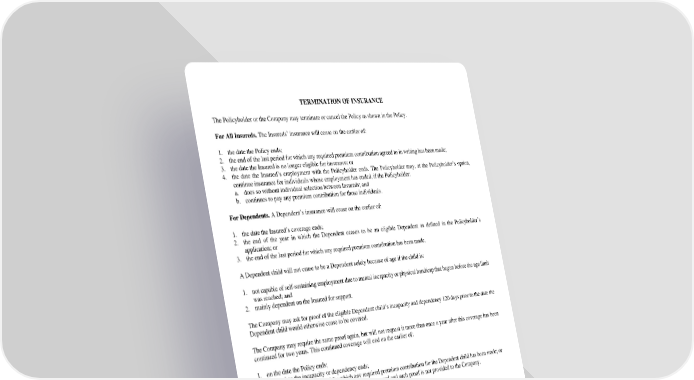 TERMINATION OF INSURANCE The Policyholder or the Company may terminate or cancel the Policy as shown in the Policy. For All Insureds. The Insureds’ insurance will cease on the earlier of: 1. the date the Policy ends; 2. the end of the last period for which any required premium contribution agreed to in writing has been made; 3. the date the Insured is no longer eligible for insurance; or 4. the date the Insured’s employment with the Policyholder ends. The Policyholder may, at the Policyholder’s option, continue insurance for individuals whose employment has ended, if the Policyholder: a. does so without individual selection between Insureds; and b. continues to pay any premium contribution for those individuals. For Dependents. A Dependent’s insurance will cease on the earlier of: 1. the date the Insured’s coverage ends; 2. the end of the year in which the Dependent ceases to be an eligible Dependent as defined in the Policyholder’s application; or 3. the end of the last period for which any required premium contribution has been made. A Dependent child will not cease to be a Dependent solely because of age if the child is: 1. not capable of self-sustaining employment due to mental incapacity or physical handicap that began before the age limit was reached; and 2. mainly dependent on the Insured for support. The Company may ask for proof of the eligible Dependent child’s incapacity and dependency 120 days prior to the date the Dependent child would otherwise cease to be covered. The Company may require the same proof again, but will not request it more than once a year after this coverage has been continued for two years. This continued coverage will end on the earlier of: 1. on the date the Policy ends; 2. on the date the incapacity or dependency ends; 3. on the end of the last period for which any required premium contribution for the Dependent child has been made; or 4. 60 days following the date the Company requests proof and such proof is not provided to the Company. PREMIUMS The Company provides insurance coverage in return for premium payment. Premiums are payable to the Company by the Policyholder on behalf of the Insured Person. The Insured Person’s first premium is due on the Insured Person’s Effective Date. Premiums must be paid to the Company on or before the due date. The initial premium rates are shown in the Policyholder’s application. Premium Changes. The Company has the right to change the premium rates on any premium due date as allowed in the Policy. The Company will provide written notice to the Policyholder at least 31 days before the date of the change. The premium rates also may be changed at any time the terms of the Policy are changed. Grace Period. The Policy has a 31-day grace period for the payment of each premium due after the first premium. Coverage will continue in force during the grace period. Coverage will terminate at the end of the grace period if all premiums due are not paid. The Company will require payment of all premiums for the period this coverage continues in force, including the premiums for the grace period. The grace period will not apply if the Company receives written notice of the Policyholder’s or the Insured’s intent to terminate coverage. C-9184IN 6