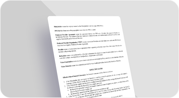 Policyholder means the employer named as the Policyholder in the face page of the Policy. PPO Service Area means the geographical area where the PPO is located. Preferred Provider Agreement means the agreement between the PPO and a Provider who agrees to become an In-Network Provider. The Preferred Provider Agreement contains the rates and reimbursement methods for services and supplies furnished by an In-Network Provider. Preferred Provider Organization (“PPO”) means a network of Providers and retail chain stores within the PPO Service Area that have signed a Preferred Provider Agreement. Provider means a licensed physician or optometrist who is operating within the scope of his or her license. Provider also includes a dispensing optician. Refraction means a test performed by a Provider to determine the glasses or contact lens prescription due to a refractive error (for example, nearsightedness, farsightedness, astigmatism or presbyopia). Vision Examination means any eye or visual examination covered under the Policy and shown in the Schedule of Benefits. Vision Materials means those materials provided for visual health and welfare shown in the Schedule of Benefits. EFFECTIVE DATES Effective Date of Insured’s Insurance. The Insured’s insurance will be effective as follows: 1. if the Policyholder does not require the Insured to contribute toward the premium for this coverage, the Insured’s insurance will be effective on the date the Insured becomes eligible; 2. if the Policyholder requires the Insured to contribute toward the premium for this coverage, the Insured’s insurance will be effective on the date the Insured becomes eligible, provided; a. the Insured has given the Company the Insured’s enrollment form (if required) on, prior to, or within 30 days of the date the Insured becomes eligible; and b. the Insured has agreed to pay the required premium contributions; and 3. if the Insured fails to meet the requirements of 2 a) and 2 b) within 30 days after becoming eligible, the Insured’s coverage will not become effective until the Company has verified that the Insured has met these requirements. The Insured will then be advised of the Insured’s effective date. Effective Date of Dependents’ Insurance. Coverage for Dependents becomes effective on the later of: 1. the date Dependent coverage is first included in the Insured’s coverage; or 2. the premium due date on or after the date the person first qualifies as the Insured’s Dependent. If an enrollment form is required, the Insured must provide such form and agree to pay any premium contribution that may be required prior to coverage becoming effective. If the Insured and the Insured’s spouse are both Insureds, one Insured may request to be a Dependent spouse of the other. A Dependent child may not be covered by more than one Insured. Newborn Children. A Dependent child born while the Insured’s coverage is in force will be covered from the moment of birth for 31 days or a greater number of days, if elected by the Policyholder. To continue coverage beyond this period, the Insured must provide notice to the Company and agree to pay any premium contribution that may be required within this period. Adopted Children. If a Dependent child is placed with the Insured for adoption while the Insured’s coverage is in force, this child will be covered from the earlier of: 1) the date of placement for the purpose of adoption; or 2) the date of the entry of an order granting the Insured custody of the child for purposes of adoption for 31 days or a greater number of days, if C-9184IN 4