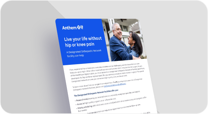 Live your life without hip or knee pain A Designated Orthopedic Network facility can help If you experience hip or knee pain, everyday activities can be challenging, and the discomfort can even keep you up at night. When other treatment options don’t provide relief, it may be time for surgery. As part of the HealthSync Options plan, you have access to a Designated Orthopedic Network of facilities specifically developed for hip and knee replacements (for your primary procedure and/or revision surgery). This special Designated Network ensures you can receive high quality care, and lower costs. To learn more about how our program can support your health journey and to see a list of Designated Orthopedic Network facilities, please visit anthem.com/indianahealthsync/. The Designated Orthopedic Network facilities offer you: • Peace of mind, knowing you received care at a nationally recognized specialty care hospital. • Access to high quality surgeons at an affordable cost. • Priority scheduling, with initial evaluations scheduled within three business days and surgeries within four weeks.1 • Concierge-level service which can help make appointments and schedule follow-up care. What does it cost? Eligible hip and knee surgeries and revisions at one of these Designated Orthopedic Network facilities will be covered under your benefit plan, with normal cost-sharing (such as deductibles or coinsurance) applying. To receive these benefits, procedures must be performed one of the Designated Orthopedic Network facilities. Services received at a facility outside of the Designated Orthopedic Network are not eligible for coverage under any benefit tier; however, you may request an exception through the appeal process, and individual circumstances will be reviewed.2 Learn more Call the number on your member ID card to see if your suggested procedure is eligible for coverage. 1 Your time frame for surgery may vary based on when you decide to pursue surgery following a surgical recommendation and is dependent upon your current health status. 2 If a surgery is already authorized before 1/1/26, it may proceed as scheduled. Anthem Blue Cross and Blue Shield is the trade name of Anthem Insurance Companies, Inc. Independent licensee of the Blue Cross and Blue Shield Association. Anthem is a registered trademark of Anthem Insurance Companies, Inc. 1066616INMENABS 08/25
