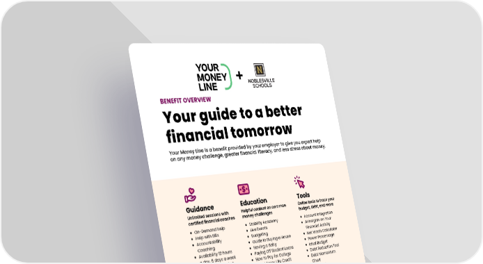 + BENEFIT OVERVIEW Your guide to a better financial tomorrow Your Money Line is a benefit provided by your employer to give you expert help on any money challenge, greater financial literacy, and less stress about money. Guidance Education Tools Unlimited sessions with Helpful content on common Online tools to track your certified financial coaches money challenges budget, debt, and more On-Demand Help Stability Academy Account Integration Help with Bills Live Events AI Insights on Your Accountability Budgeting Financial Activity Coaching Guide to Buying a House Net Worth Calculator Availability 12 hours Having a Baby Power Percentage a day, 5 days a week Paying Off Student Loans Ideal Budget Accessible via chat, How to Pay for College Debt Reduction Tool email, or phone Your Money Life Credit Debt Momentum Investing Chart In your 20's, 30's, 40's, 50’s PSLF Tool HSAs College Aid Coach YML provides you with free 1:1 financial guidance, education, & tools—so you can stress less about money and enjoy greater stability & confidence. Get started at: yourmoneyline.com/nobl