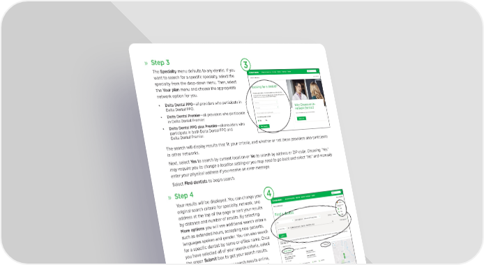» Step 3 The Specialty menu defaults to any dentist. If you want to search for a speci昀椀c specialty, select the specialty from the drop-down menu. Then, select the Your plan menu and choose the appropriate network option for you. • Delta Dental PPO—all providers who participate in Delta Dental PPO. • Delta Dental Premier—all providers who participate in Delta Dental Premier. • Delta Dental PPO plus Premier—all providers who participate in both Delta Dental PPO and Delta Dental Premier. The search will display results that 昀椀t your criteria, and whether or not those providers also participate in other networks. Next, select Yes to search by current location or No to search by address or ZIP code. Choosing “Yes” may require you to change a location setting or you may need to go back and select “No” and manually enter your physical address if you receive an error message. Select Find dentists to begin search. » Step 4 Your results will be displayed. You can change your 4 original search criteria for specialty, network, and address at the top of the page or sort your results by distance and number of results. By selecting More options you will see additional search criteria such as extended hours, accepting new patients, languages spoken and gender. You can also search for a speci昀椀c dentist by name or o昀케ce name. Once you have selected all of your search criteria, select the green Submit box to get your search results. In addition to viewing your search results online, you can print or email your results, or view your results as a PDF under My list. To add dentists to your list, select the Add to my list or Add all to my list checkboxes. Once you have added results to your list, select the down arrow to save as a PDF, print or email your list. Unsure of your plan type or looking for additional information? Register or log in to the Consumer Toolkit®, Delta Dental’s secure online tool for access to eligibility information, current bene昀椀ts information, claims information and more. Learn more at www.deltadentalin.com/consumertoolkit. www.deltadentalin.com/昀椀ndadentist FLI-6299-IN v4 PA 9/18