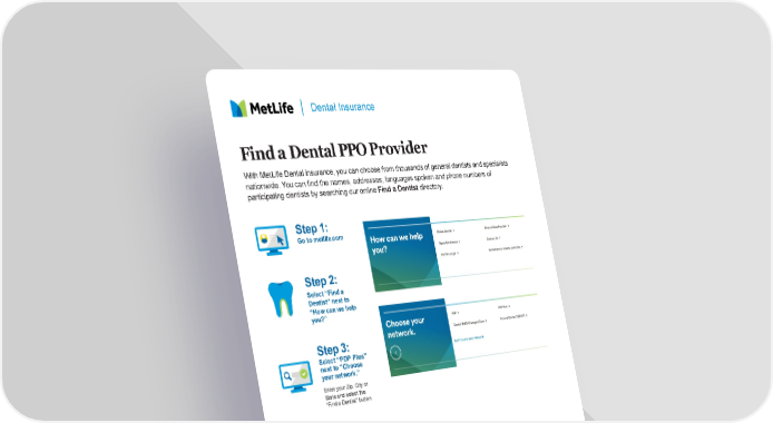Dental Insurance Like most group benefit programs, benefit programs offered by MetLife and its affiliates contain certain exclusions, exceptions, waiting periods, reductions, limitations and terms for keeping them in force. Please contact MetLife or your plan administrator for complete details. © 2024 MetLife Services and Solutions, LLC. Metropolitan Life Insurance Company | 200 Park Avenue | New York, NY 10166 Finda Dental PPO Provider With MetLife Dental insurance, you can choose from thousands of general dentists and specialists nationwide. You can find the names, addresses, languages spoken and phone numbers of participating dentists by searching our online Find a Dentist directory. Step 1: Go to metlife.com Step 2: Select “Find a Dentist” next to “How can we help you?” Step 3: Select “PDP Plus” next to “Choose your network.” Enter your Zip, City or State and select the “Find a Dentist” button. Finding the right dentist is important, MetLife SpotLite on Oral Healthsm is a recognition awarded to dentists for a focus on preventive oral care and improved oral health outcomes. Look for the MetLife SpotLite badge when selecting a dentist. What's New?
