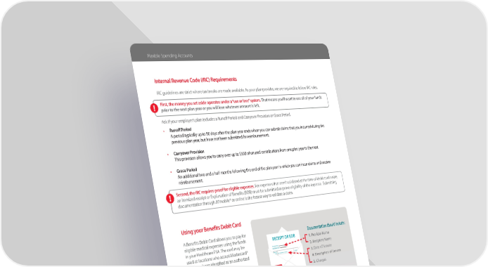 Flexible Spending Accounts Internal Revenue Code (IRC) Requirements IRC guidelines are strict where tax breaks are made available. As your plan provider, we are required to follow IRC rules. ! First, the money you set aside operates under a “use or lose” system. That means you’ll want to use all of your funds prior to the next plan year or you will lose whatever amount is left. Ask if your employer’s plan includes a Runoff Period and Carryover Provision or Grace Period. • Runoff Period A period typically up to 90 days after the plan year ends when you can submit claims that you incurred during the previous plan year, but have not been submitted for reimbursement. • Carryover Provision This provision allows you to carry over up to $500 of unused contributions from one plan year to the next. • Grace Period An additional two and a half months following the end of the plan year in which you can incur claims and receive reimbursement. ! Second, the IRC requires proof for eligible expenses. For expenses that aren’t validated at the time of debit card swipe, an itemized receipt or Explanation of Benefits (EOB) must be submitted to prove eligibility of the expense. Submitting documentation through AFmobile® or online is the fastest way to validate a claim. Using your Benefits Debit Card A Benefits Debit Card allows you to pay for Documentation should include: eligible medical expenses using the funds RECEIPT OR EOB in your Healthcare FSA. The card may be 1. Provider Name Provider Name used at locations who accept Mastercard® Reciepient Name 2. Recipient Name Date of and have been identified as an authorized Service Description of Services Charges 3. Date of Service medical merchant. 4. Description of Service 5. Charges To verify transactions, submit an EOB or itemized receipt after your transaction or if Debit you receive a documentation request letter. Learn more about your debit card at americanfidelity.com/debit-card American Fidelity Assurance Company americanfidelity.com SB-32911-0220