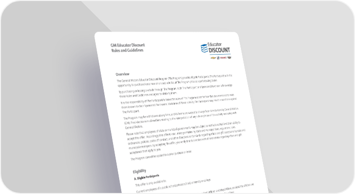 Overview The General Motors Educator Discount Program (The Program) provides eligible Participants (The Participant) with the opportunity to purchase/lease new or unused vehicles at The Program price at a participating dealer. By purchasing or leasing a vehicle through The Program, both The Participant and Sponsored Purchaser acknowledge these Rules and Guidelines and agree to abide by them. It is the responsibility of The Participant to know the rules of The Program as set forth in this document and to make them known to their Sponsored Purchasers. Violations of these rules by The Participant may result in sanctions against The Participant. The Program may be withdrawn at any time, and its terms are subject to change from time to time by General Motors (GM). Final decisions in all matters relating to the interpretation of any rule or phrase of this activity rest solely with General Motors. Please note that employees of state or municipal governments may be subject to restrictions that limit their ability to accept this offer. Accordingly, this offer is void unless permitted by state and municipal laws, regulations, rules, ordinances, policies, codes of conduct, and other directives or standards regarding ethics and gift acceptance by state and municipal employees. By accepting this offer, you verify that it complies with all restrictions regarding ethics and gift acceptance that apply to you. The Program cannot be applied to a prior purchase or lease. Eligibility A. Eligible Participants This offer is only available to: Current employees of a public school, private school, university or college. B. Sponsored Purchasers Eligible Participants are able to sponsor their spouse and dependent children and stepchildren, provided the children are either under 21 years of age or full-time students under 25 years of age on the date of purchase. C. Required Documentation Participants must present the following, along with a valid authorization number, to a participating GM Dealer in order to purchase or lease under The Program: 1) A copy of The Participant’s valid school ID/badge or a copy of a current (within the last 30 days) pay stub with all information redacted except the date of the pay stub, Participant’s name (payee) and name of the school (payer). 2) A copy of The Participant’s driver’s license with the driver’s license number redacted. Program Rules General Motors will conduct periodic audits to ensure the integrity of The Program. Participants may be asked to furnish documentation supporting their eligibility with these rules. Documentation of Program eligibility may include: GM Educator Discount Rules and Guidelines