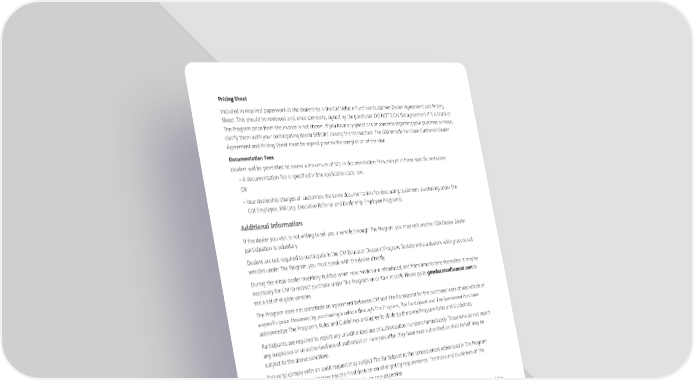 Pricing Sheet Included in required paperwork at the dealership is the GM Vehicle Purchase Customer-Dealer Agreement and Pricing Sheet. This should be reviewed and, once complete, signed by the purchaser. DO NOT SIGN the agreement if it is blank or The Program price from the invoice is not shown. If you have any questions or concerns regarding your purchase or lease, clarify them with your participating dealer BEFORE closing the transaction. The GM Vehicle Purchase Customer-Dealer Agreement and Pricing Sheet must be signed prior to the completion of the deal. Documentation Fees Dealers will be permitted to assess a maximum of $75 in documentation fees, except in these specific instances: • A documentation fee is specified in the applicable state law; OR • Your dealership charges all customers the same documentation fee (excluding customers purchasing under the GM Employee, Military, Executive Referral and Dealership Employee Programs). Additional Information If the dealer you visit is not willing to sell you a vehicle through The Program, you may visit another GM Dealer. Dealer participation is voluntary. Dealers are not required to participate in the GM Educator Discount Program. To determine a dealer’s willingness to sell vehicles under The Program, you must speak with the dealer directly. During the initial dealer inventory buildup when new models are introduced, and from time to time thereafter, it may be necessary for GM to restrict purchase under The Program on certain models. Please go to gmeducatordiscount.com to see a list of eligible vehicles. The Program does not constitute an agreement between GM and The Participant for the purchase/lease of any vehicle at a specific price. However, by purchasing a vehicle through The Program, The Participant and The Sponsored Purchaser acknowledge The Program’s Rules and Guidelines and agree to abide by the same Program Rules and Guidelines. Participants are required to report any unauthorized use of authorization numbers immediately. Those who do not report any suspicious or unauthorized use of authorization numbers after they have been submitted on their behalf may be subject to the above sanctions. Failure to comply with an audit request may subject The Participant to the consequences referenced in The Program Rules section. General Motors has the final decision on all eligibility requirements. The Rules and Guidelines of The Program may be modified by GM at any time, in its sole discretion. Compliance With Applicable Laws If any law or regulation is adopted or interpreted which, in GM’s opinion, prohibits or penalizes the implementation of The Program, GM may, in its sole discretion, cancel The Program or any order submitted pursuant to The Program without any further obligation and without any liability to either the dealer or The Participant. GENERAL MOTORS TERMS AND CONDITIONS CANNOT BE MODIFIED BY ANYONE OTHER THAN GENERAL MOTORS. GM (Rev 8/1/19) The marks of General Motors, its divisions, slogans, emblems, vehicle model names, vehicle body designs and other marks appearing in this document are the trademarks and/or service marks of General Motors, its subsidiaries, affiliates or licensors. ©2019 General Motors. Buckle up, America!