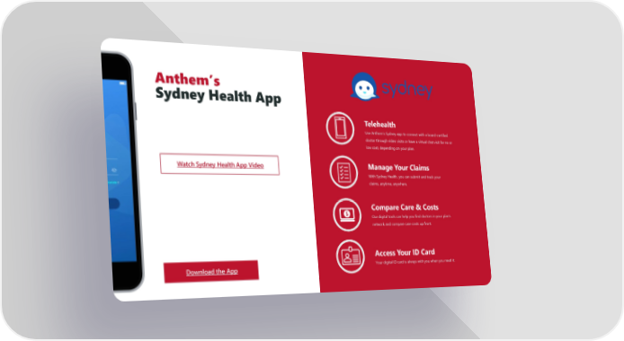 Anthem’s Sydney Health App Telehealth Use Anthem’s Sydney app to connect with a board-certified doctor through video visits or have a virtual chat visit for no or low cost, depending on your plan. Watch Sydney Health App Video Manage Your Claims With Sydney Health, you can submit and track your claims, anytime, anywhere. Compare Care & Costs Our digital tools can help you find doctors in your plan’s network and compare care costs up front. Access Your ID Card Download the App Your digital ID card is always with you when you need it.