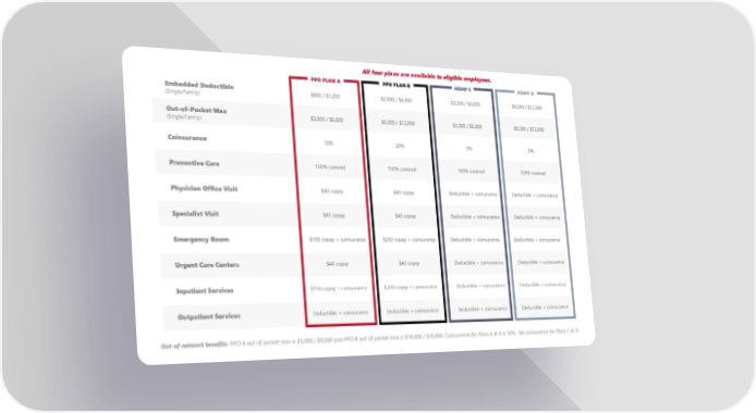 All four plans are available to eligible employees. PPO PLAN A PPO PLAN B HDHP C HDHP D Embedded Deductible $600 / $1,200 $2,000 / $4,000 $3,300 / $6,600 $6,000 / $12,000 (Single/Family) Out-of-Pocket Max $3,000 / $6,000 $6,000 / $12,000 $3,300 / $6,600 $6,000 / $12,000 (Single/Family) Coinsurance 10% 20% 0% 0% Preventive Care 100% covered 100% covered 100% covered 100% covered Physician Office Visit $40 copay $40 copay Deductible + coinsurance Deductible + coinsurance Specialist Visit $45 copay $45 copay Deductible + coinsurance Deductible + coinsurance Emergency Room $100 copay + coinsurance $200 copay + coinsurance Deductible + coinsurance Deductible + coinsurance Urgent Care Centers $40 copay $40 copay Deductible + coinsurance Deductible + coinsurance Inpatient Services $150 copay + coinsurance $200 copay + coinsurance Deductible + coinsurance Deductible + coinsurance Outpatient Services Deductible + coinsurance Deductible + coinsurance Deductible + coinsurance Deductible + coinsurance Out-of-network benefits: PPO A out-of-pocket max is $5,000 / $9,000 and PPO B out-of-pocket max is $10,000 / $20,000. Coinsurance for Plans A & B is 30%. No coinsurance for Plans C & D
