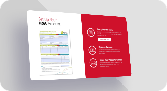 Set Up Your HSA Account Complete the Form Download and complete the HSA set-up form with Interra Credit Union. Fax or mail the form to the contact information located at the bottom of the PDF. Open an Account Call Interra at (574) 534-2506 or (888) 432-2848 to open your account once the set-up form has been completed and submitted. Share Your Account Number Once your account is open, notify the Goshen benefits team with your Interra-provided account number so that contributions can begin. Download the Form