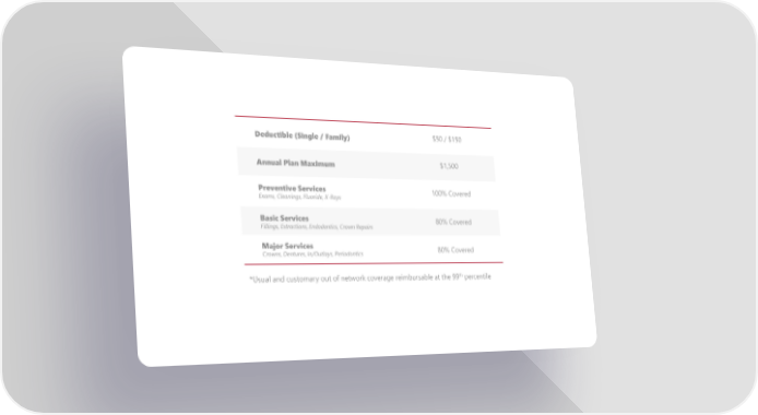 Annual Plan Maximum $1,500 100% Covered 80% Covered 80% Covered Deductible (Single / Family) $50 / $150 Preventive Services Exams, Cleanings, Fluoride, X-Rays Basic Services Fillings, Extractions, Endodontics, Crown Repairs Major Services Crowns, Dentures, In/Outlays, Periodontics *Usual and customary out of network coverage reimbursable at the 99th percentile