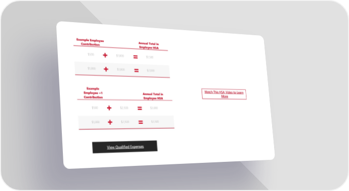 View Qualified Expenses Example Employee Contribution Company Contribution Annual Total in Employee HSA $1,000 $1,000 $2,000 $500 $1,000 $1,500 + = + = Watch This HSA Video to Learn More Example Employee +1 Contribution Company Contribution Annual Total in Employee HSA $1,000 $2,500 $3,500 $500 $2,500 $3,000 + = + =