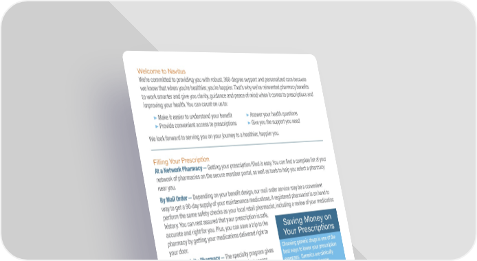 Welcome to Navitus We’re committed to providing you with robust, 360-degree support and personalized care because we know that when you’re healthier, you’re happier. That’s why we’ve reinvented pharmacy benefits to work smarter and give you clarity, guidance and peace of mind when it comes to prescriptions and improving your health. You can count on us to: ▶ Make it easier to understand your benefit ▶ Answer your health questions ▶ Provide convenient access to prescriptions ▶ Give you the support you need We look forward to serving you on your journey to a healthier, happier you. Filling Your Prescription At a Network Pharmacy — Getting your prescription filled is easy. You can find a complete list of your network of pharmacies on the secure member portal, as well as tools to help you select a pharmacy near you. By Mail Order — Depending on your benefit design, our mail order service may be a convenient way to get a 90-day supply of your maintenance medications. A registered pharmacist is on hand to perform the same safety checks as your local retail pharmacist, including a review of your medication history. You can rest assured that your prescription is safe, accurate and right for you. Plus, you can save a trip to the Saving Money on pharmacy by getting your medications delivered right to Your Prescriptions your door. At a Specialty Pharmacy — The specialty program gives Choosing generic drugs is one of the members with chronic conditions convenient access best ways to lower your prescription to specialty medications. This provides a high level of expenses. Generics are clinically identical to their brand-name personalized care and guidance to help successfully counterparts and go through the reduce side e昀昀ects, minimize complications and improve same rigorous U.S. Food and Drug quality of life. Administration (FDA) process as brand Filing A Claim name drugs. Rest assured they have We’re dedicated to making your pharmacy benefits easy the same safety, quality, strength and accessible. If you have a concern about a benefit, and e昀昀ectiveness as brand name medications. To get started simply ask claim or other service, please call customer care. If we can’t your prescriber if a generic is available resolve your issue, you have the right to file an appeal. To for your prescription. file a manual claim, fill out the form located in your member portal and mail or fax your claim form and documentation to us. Our customer care number and claims address are listed on the back. We’ll work to answer your questions and resolve your concerns quickly. Sharing Your Feedback We welcome you to share your feedback, concerns or complaints, or to report any errors. We consider it a top priority to act on this information and correct errors, prevent future issues and ensure quality and safe care. To provide feedback, please call the Customer Care number listed on the back cover.