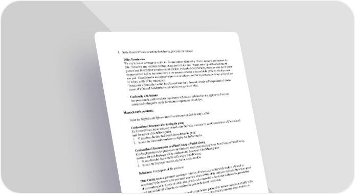 3. In the General Provisions section, the following provisions are replaced: Policy Termination We may terminate coverage on or after the first anniversary of the policy effective date as of any premium due date. Subscriber may terminate coverage on any premium due date. Written notice by certified mail must be given at least 60 days prior to such premium due date. Failure by Subscriber to pay premiums when due or within the grace period shall be deemed notice to Us to terminate coverage at the end of the period for which premium was paid. Cancellation for nonpayment of premium or failure to meet the requirements for being a group will not be subject to this 60 day requirement. Termination will not affect a claim for a Covered Loss that is the result, directly and independently of all other causes, of a Covered Accident that occurs while coverage was in effect. Conformity with Statutes Any provisions in conflict with the requirements of Louisiana or federal law that apply to this Policy are automatically changed to satisfy the minimum requirements of such laws. Massachusetts residents: Under the Eligibility and Effective Date Provisions section, the following is added: Continuation of Insurance after leaving the group If a Covered Person leaves the group covered under the Policy, insurance for such Covered Person will be continued until the earliest of the following dates: 1. 31 days from the date the Covered Person leaves the group; 2. the date the Covered Person becomes eligible for similar benefits. Continuation of Insurance due to a Plant Closing or Partial Closing If an Employee leaves the group due to termination of employment resulting from a Plant Closing or Partial Closing, insurance for such Employee will be continued until the earliest of the following dates: 1. 90 days from the date of the Plant Closing or Partial Closing; 2. the date the Employee becomes eligible for similar benefits. Definitions: For purposes of this provision: Plant Closing means a permanent cessation or reduction of business at a facility which results or will result as determined by the director in the permanent separation of at least 90% of the employees of said facility within a period of six months prior to the date of certification or with such other period as the director shall prescribe, provided that such period shall fall within the six month period prior to the date of certification. Partial Closing means a permanent cessation of a major discrete portion of the business conducted at a facility which results in the termination of a significant number of the employees of said facility and which affects workers and communities in a manner similar to that of Plant Closings. Missouri residents: 1. Under the General Definitions section, the definition of Covered Accident does not include reference to an ''external'' event. 2. Under the General Definitions section, the definition of Totally Disabled or Total Disability means either: a) the inability of the Covered Person who is currently employed to perform the material and substantial duties of the Covered Person’s occupation for a period of at least twelve months. After the initial benefit period, total disability shall mean the Covered Person’s inability to perform the material and substantial duties of any occupation for which the Covered Person is qualified by education, training or experience; or b) the inability of the Covered Person who is not currently employed to perform all of the activities of daily living including eating, transferring, dressing, toileting, bathing, and continence, without human supervision or assistance. 20