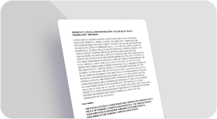 IMPORTANT CANCELLATION INFORMATION – PLEASE READ ''POLICY TERMINATION'' PROVISION UNDER NORTH CAROLINA GENERAL STATUTE SECTION 58-50-40, NO PERSON, EMPLOYER, PRINCIPAL, AGENT, TRUSTEE, OR THIRD PARTY ADMINISTRATOR, WHO IS RESPONSIBLE FOR THE PAYMENT OF GROUP HEALTH OR LIFE INSURANCE OR GROUP HEALTH PLAN PREMIUMS, SHALL: (1) CAUSE THE CANCELLATION OR NONRENEWAL OF GROUP HEALTH OR LIFE INSURANCE, HOSPITAL, MEDICAL, OR DENTAL SERVICE CORPORATION PLAN, MULTIPLE EMPLOYER WELFARE ARRANGEMENT, OR GROUP HEALTH PLAN COVERAGES AND THE CONSEQUENTIAL LOSS OF THE COVERAGES OF THE PERSONS INSURED, BY WILLFULLY FAILING TO PAY THOSE PREMIUMS IN ACCORDANCE WITH THE TERMS OF THE INSURANCE OR PLAN CONTRACT, AND (2) WILLFULLY FAIL TO DELIVER, AT LEAST 45 DAYS BEFORE THE TERMINATION OF THOSE COVERAGES, TO ALL PERSONS COVERED BY THE GROUP POLICY A WRITTEN NOTICE OF THE PERSON'S INTENTION TO STOP PAYMENT OF PREMIUMS. THIS WRITTEN NOTICE MUST ALSO CONTAIN A NOTICE TO ALL PERSONS COVERED BY THE GROUP POLICY OF THEIR RIGHTS TO HEALTH INSURANCE CONVERSION POLICIES UNDER ARTICLE 53 OF CHAPTER 58 OF THE GENERAL STATUTES AND THEIR RIGHTS TO PURCHASE INDIVIDUAL POLICIES UNDER THE FEDERAL HEALTH INSURANCE PORTABILITY AND ACCOUNTABILITY ACT AND UNDER ARTICLE 68 OF CHAPTER 58 OF THE GENERAL STATUTES. VIOLATION OF THIS LAW IS A FELONY. ANY PERSON VIOLATING THIS LAW IS ALSO SUBJECT TO A COURT ORDER REQUIRING THE PERSON TO COMPENSATE PERSONS INSURED FOR EXPENSES OR LOSSES INCURRED AS A RESULT OF THE TERMINATION OF THE INSURANCE. Texas residents: THE INSURANCE POLICY UNDER WHICH THIS CERTIFICATE IS ISSUED IS NOT A POLICY OF WORKERS’ COMPENSATION INSURANCE. YOU SHOULD CONSULT YOUR EMPLOYER TO DETERMINE WHETHER YOUR EMPLOYER IS A SUBSCRIBER TO THE WORKERS’ COMPENSATION SYSTEM.