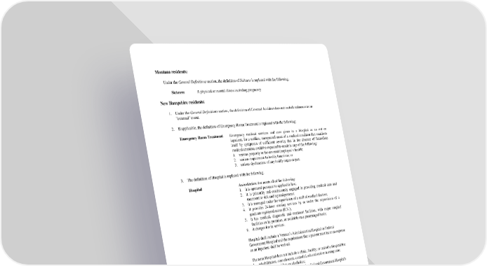 Montana residents: Under the General Definitions section, the definition of Sickness is replaced with the following: Sickness A physical or mental illness including pregnancy New Hampshire residents: 1. Under the General Definitions section, the definition of Covered Accident does not include reference to an ''external'' event. 2. If applicable, the definition of Emergency Room Treatment is replaced with the following: Emergency Room Treatment Emergency medical services and care given in a Hospital as an out or inpatient, for a sudden, unexpected onset of a medical condition that manifests itself by symptoms of sufficient severity that in the absence of immediate medical attention could be expected to result in any of the following: 1. serious jeopardy to the covered Employee’s health; 2. serious impairment to bodily functions; or 3. serious dysfunction of any bodily organ or part. 3. The definition of Hospital is replaced with the following. Hospital An institution that meets all of the following: 1. it is operated pursuant to applicable law; 2. it is primarily and continuously engaged in providing medical care and treatment to sick and injured persons; 3. it is managed under the supervision of a staff of medical doctors; 4. it provides 24-hour nursing services by or under the supervision of a graduate registered nurse (R.N.); 5. it has medical, diagnostic and treatment facilities, with major surgical facilities on its premises, or available on a prearranged basis; 6. it charges for its services. Hospital shall include a Veteran’s Administration Hospital or Federal Government Hospital and the requirement that a patient must incur an expense as an Inpatient shall be waived. The term Hospital does not include a clinic, facility, or unit of a Hospital for: 1. rehabilitation, convalescent, custodial, educational or nursing care; 2. the aged, drug addicts or alcoholics; 3. a Veteran’s Administration Hospital or Federal Government Hospitals unless the Covered Person incurs an expense. 21