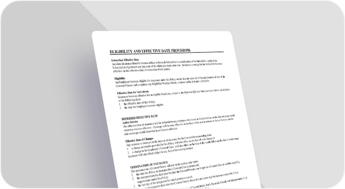 ELIGIBILITY AND EFFECTIVE DATE PROVISIONS Subscriber Effective Date Accident Insurance Benefits become effective for each Subscriber in consideration of the Subscriber's application, Subscription Agreement and payment of the initial premium when due. Insurance coverage for the Subscriber becomes effective on the Effective Date of Subscriber Participation. Eligibility An Employee becomes eligible for insurance under this Policy on the date he meets all of the requirements of one of the Covered Classes and completes any Eligibility Waiting Period, as shown in the Schedule of Benefits. Effective Date for Individuals Insurance becomes effective for an eligible Employee, subject to the Deferred Effective Date provision below, on the latest of the following dates: 1. the effective date of this Policy; 2. the date the Employee becomes eligible. DEFERRED EFFECTIVE DATE Active Service The effective date of insurance will be deferred for any Employee who is not in Active Service on the date coverage would otherwise become effective. Coverage will become effective on the later of the date he returns to Active Service and the date coverage would otherwise have become effective. Effective Date of Changes Any increase or decrease in the amount of insurance for the Covered Person resulting from: 1. a change in benefits provided by this Policy will take effect on the date of such change; or 2. a change in the Employee’s Covered Class. will take effect on the first of the month following the date of such change Increases will take effect subject to any Active Service requirement. TERMINATION OF INSURANCE The insurance on a Covered Person will end on the earliest date below: 1. the date this Policy or insurance for a Covered Class is terminated; 2. the next premium due date after the date the Covered Person is no longer in a Covered Class or satisfies eligibility requirements under this Policy; 3. the last day of the last period for which premium is paid; 4. the next premium due date after the Covered Person attains the maximum Age for insurance under this Policy. Termination will not affect a claim for a Covered Loss or Covered Injury that is the result, directly and independently of all other causes, of a Covered Accident that occurs while coverage was in effect. CONTINUATION OF INSURANCE Continuation for Layoff, Leave of Absence, Family Medical Leave or Furlough Insurance for an Employee and Covered Dependents may be continued until the earliest of the following dates if: (a) an Employee is on a temporary layoff, an Employer-approved leave of absence, an Employer-approved family medical leave or a furlough, a temporary suspension or alteration of Active Service initiated by the Employer for a period of time specified in advance, but not to exceed the maximum benefit period at a time; and (b) required premium contributions are paid when due. 1. for a layoff: 12 months. 2. for an Employer-approved leave of absence: 12 months. 3. for an Employer-approved family medical leave: up to the later of the period of the approved FMLA leave or the leave period required by law in the state in which the Employee is employed. 4. for furlough: up to 12 weeks. GA-00-1300.00 6