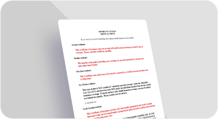 IMPORTANT NOTICES GROUP ACCIDENT If you reside in one of the following states, please read the important notices below: Arizona residents: This certificate of insurance may not provide all benefits and protections provided by law in Arizona. Please read this certificate carefully. Florida residents: The benefits of the policy providing your coverage are governed primarily by the laws of a state other than Florida. Maryland residents: This Certificate may omit some of the benefits required for a Certificate issued and delivered in Maryland. New Mexico residents: This type of plan is NOT considered ''minimum essential coverage'' under the Affordable Care Act (ACA) and therefore does NOT satisfy the individual mandate that you have health insurance coverage. If you do not have other health insurance coverage, you may be subject to a federal tax penalty. Please consult your tax advisor. TL-00-6000a.NM North Carolina residents: This Certificate of Insurance provides all of the benefits mandated by the North Carolina Insurance Code, but it is issued under a group master policy located in another state and may be governed by that state’s law. THIS CERTIFICATE IS NOT A MEDICARE SUPPLEMENT CERTIFICATE. IF YOU ARE ELIGIBLE FOR MEDICARE, REVIEW THE GUIDE TO HEALTH INSURANCE FOR PEOPLE WITH MEDICARE, WHICH IS AVAILABLE FROM LIFE INSURANCE COMPANY OF NORTH AMERICA. The Policy is a legal contract between the Policyholder and Us. BENEFITS MAY BE REDUCED. PLEASE SEE THE SCHEDULE OF BENEFITS