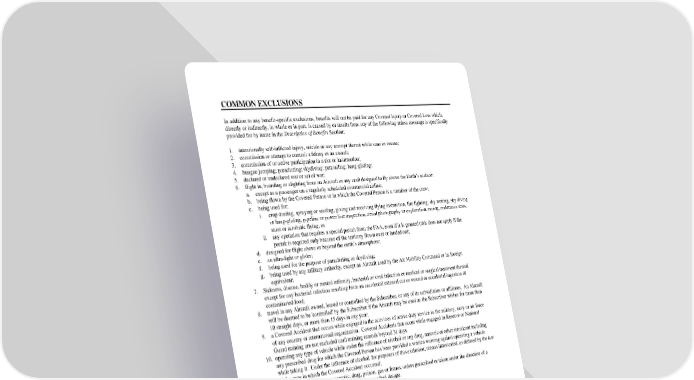 COMMON EXCLUSIONS In addition to any benefit-specific exclusions, benefits will not be paid for any Covered Injury or Covered Loss which, directly or indirectly, in whole or in part, is caused by or results from any of the following unless coverage is specifically provided for by name in the Description of Benefits Section: 1. intentionally self-inflicted injury, suicide or any attempt thereat while sane or insane; 2. commission or attempt to commit a felony or an assault; 3. commission of or active participation in a riot or insurrection; 4. bungee jumping; parachuting; skydiving; parasailing; hang-gliding; 5. declared or undeclared war or act of war; 6. flight in, boarding or alighting from an Aircraft or any craft designed to fly above the Earth’s surface: a. except as a passenger on a regularly scheduled commercial airline; b. being flown by the Covered Person or in which the Covered Person is a member of the crew; c. being used for: i. crop dusting, spraying or seeding, giving and receiving flying instruction, fire fighting, sky writing, sky diving or hang-gliding, pipeline or power line inspection, aerial photography or exploration, racing, endurance tests, stunt or acrobatic flying; or ii. any operation that requires a special permit from the FAA, even if it is granted (this does not apply if the permit is required only because of the territory flown over or landed on); d. designed for flight above or beyond the earth’s atmosphere; e. an ultra-light or glider; f. being used for the purpose of parachuting or skydiving; g. being used by any military authority, except an Aircraft used by the Air Mobility Command or its foreign equivalent; 7. Sickness, disease, bodily or mental infirmity, bacterial or viral infection or medical or surgical treatment thereof, except for any bacterial infection resulting from an accidental external cut or wound or accidental ingestion of contaminated food; 8. travel in any Aircraft owned, leased or controlled by the Subscriber, or any of its subsidiaries or affiliates. An Aircraft will be deemed to be 'controlled' by the Subscriber if the Aircraft may be used as the Subscriber wishes for more than 10 straight days, or more than 15 days in any year; 9. a Covered Accident that occurs while engaged in the activities of active duty service in the military, navy or air force of any country or international organization. Covered Accidents that occur while engaged in Reserve or National Guard training are not excluded until training extends beyond 31 days. 10. operating any type of vehicle while under the influence of alcohol or any drug, narcotic or other intoxicant including any prescribed drug for which the Covered Person has been provided a written warning against operating a vehicle while taking it. Under the influence of alcohol, for purposes of this exclusion, means intoxicated, as defined by the law of the state in which the Covered Accident occurred; 11. voluntary ingestion of any narcotic, drug, poison, gas or fumes, unless prescribed or taken under the direction of a Physician and taken in accordance with the prescribed dosage. GA-00-1403.00 7