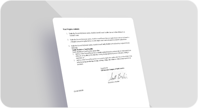 West Virginia residents: 1. Under the General Definitions section, the definition of Covered Accident does not include reference to an ''external'' event. 2. Under the General Definitions section, the definition of Hospital does not require that an institution be licensed as a Hospital pursuant to applicable law, but does require that an institution operate pursuant to applicable law. 3. Under the General Definitions section, the definition of Totally Disabled or Total Disability is replaced with the following: Totally Disabled or Total Disability Totally Disabled or Total Disability means either: 1. inability of the Covered Person who is currently employed to perform substantially all of the material duties of his job, or any other job for which he is or may become qualified by reason of education, training or experience; or 2. inability of the Covered Person who is not currently employed to perform all of the activities of daily living including eating, transferring, dressing, toileting, bathing, and continence, without human supervision or assistance. Signed for the Life Insurance Company of North America Scott Berlin, President GA-00-3000.00 23