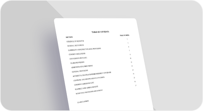TABLE OF CONTENTS SECTION PAGE NUMBER SCHEDULE OF BENEFITS 1 GENERAL DEFINITIONS 3 ELIGIBILITY AND EFFECTIVE DATE PROVISIONS 6 COMMON EXCLUSIONS 7 CONVERSION PRIVILEGE 8 CLAIM PROVISIONS 10 ADMINISTRATIVE PROVISIONS 12 GENERAL PROVISIONS 13 ACCIDENTAL DEATH AND DISMEMBERMENT COVERAGE 14 EXPOSURE AND DISAPPEARANCE COVERAGE 15 COMMON CARRIER BENEFIT 15 SEATBELT AND AIRBAG BENEFIT 16 MODIFYING PROVISIONS AMENDMENT 17 GA-00-CE1000.00