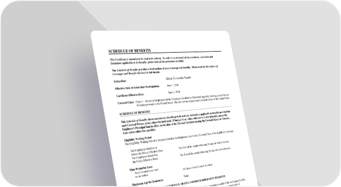SCHEDULE OF BENEFITS This Certificate is intended to be read in its entirety. In order to understand all the conditions, exclusions and limitations applicable to its benefits, please read all the provisions carefully. The Schedule of Benefits provides a brief outline of your coverage and benefits. Please read the Description of Coverages and Benefits Section for full details. Subscriber: Elkhart Community Schools Effective Date of Subscriber Participation: June 1, 2016 Certificate Effective Date: June 1, 2024 Covered Class: Class 4 - All active Employees of the Employer classified as Classified, regularly working a minimum of 30 hours per week in the United States, who are citizens or permanent resident aliens of the United States. SCHEDULE OF BENEFITS This Schedule of Benefits shows maximums, benefit periods and any limitations applicable to benefits provided for each Covered Person unless otherwise indicated. Principal Sum, when referred to in this Schedule, means the Employee’s Principal Sum in effect on the date of the Covered Accident causing the Covered Injury or Covered Loss unless otherwise specified. Eligibility Waiting Period The Eligibility Waiting Period is the period of time the Employee must be in a Covered Class to be eligible for coverage. For Employees hired on or before the Policy Effective Date: The first of the month following 56 days of Active Service For Employees hired after the Policy Effective Date: The first of the month following 56 days of Active Service Time Period for Loss: Any Covered Loss must occur within: 365 days of the Covered Accident Maximum Age for Insurance: None BASIC ACCIDENTAL DEATH AND DISMEMBERMENT BENEFITS Employee Principal Sum: 1 times Annual Compensation rounded to the next higher $1,000, if not already a multiple thereof, subject to a maximum of $125,000. Changes in the Covered Person's amount of insurance resulting from a change in the Employee's amount of Annual Compensation take effect, subject to any Active Service requirement, on the first day of the month following the change in Annual Compensation. 1