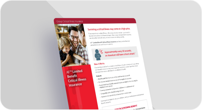 Surviving a critical illness may come at a high price. If you experience a critical illness—like a heart attack or stroke—you shouldn't have to worry about the financial impact. But co-pays, transportation expenses, out-of-pocket medical costs, and lost income can add up quickly. AF™ Limited Benefit Critical Illness Insurance can help provide financial protection so you can focus on recovery. AF™ Limited Benefit Critical Illness Insurance 1AHA 2021 Heart Disease and Stroke Statistics Update Fact Sheet At-a-Glance; January 26, 2021, p2 How It Works If you're diagnosed with a covered critical illness, this plan is designed to pay a lump sum benefit amount to help cover expenses. In addition, certain specified critical illnesses that reoccur will allow for an additional benefit. Features: • Benefits paid directly to you, to be used however you see fit • No required medical exams as part of the application process • Guaranteed issue benefit amounts may be available for first-time eligible employees and spouse • Coverage extended to dependent children at no additional cost* • Compatible with a Health Savings Account • Option to add an infectious disease rider in select states Coverage is available for you, your children, and your lawful spouse at determined benefit amounts. Approximately every 39 seconds, an American will have a heart attack.1 HEALTH SCREENING BENEFIT This benefit covers several qualified tests, including, but not limited to: If you reside in a state other than your employer’s state of domicile, where required by law, policy provisions and benefits may vary. • Stress Test • Echocardiogram • Electrocardiogram (EKG) SCREENING BENEFIT (per calendar year per covered employee and covered spouse) $50 • Blood Glucose Testing • Neuroimaging Studies Group Critical Illness Insurance E M P LO Y E R B E N E F I T S O LU T I O N S F O R YO U R I N D U S T R Y